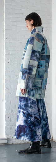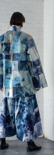 This Pre-Spring collection was my most ambitious in concept, textile, and construction. It features NOSO technology, Italian heat technology that fuses fabric together to create seams without machine stitching as well as the use of the heat press to utilize waterproof adhesive film to create my own fabric. This collection features 5 looks with a total of 9 garments and 1 accessory. The denim is the main feature of this collection where all of the denim was repurposed through new washes of bleach and ice dye. Most of the patchwork denim was mainly used from my own old jeans, worn during my public education time.